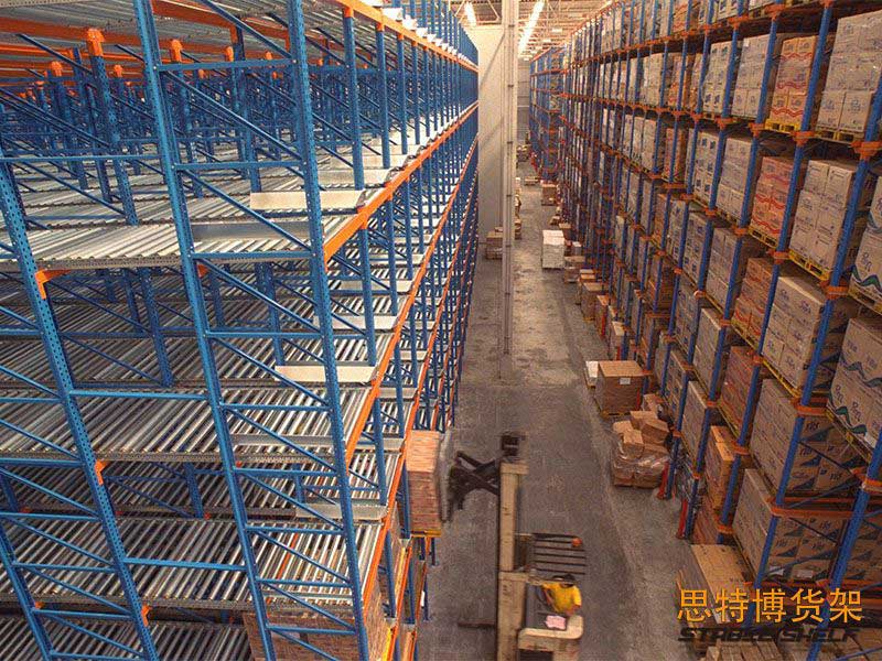 The gravity shelf is also called the roller shelf, which belongs to the pallet storage shelf in the storage shelf. The gravity shelf is one of the derivatives of the beam shelf, the shelf structure is similar to the beam shelf, but the drum track is installed on the beam, and the track is tilted 3-5°. Pallet goods are transported by forklift to the purchase port of the shelf, and the pallet automatically glides from the entrance to the pick-up port at the other end by using its own weight. The gravity shelf is a first-in-first-out storage method.